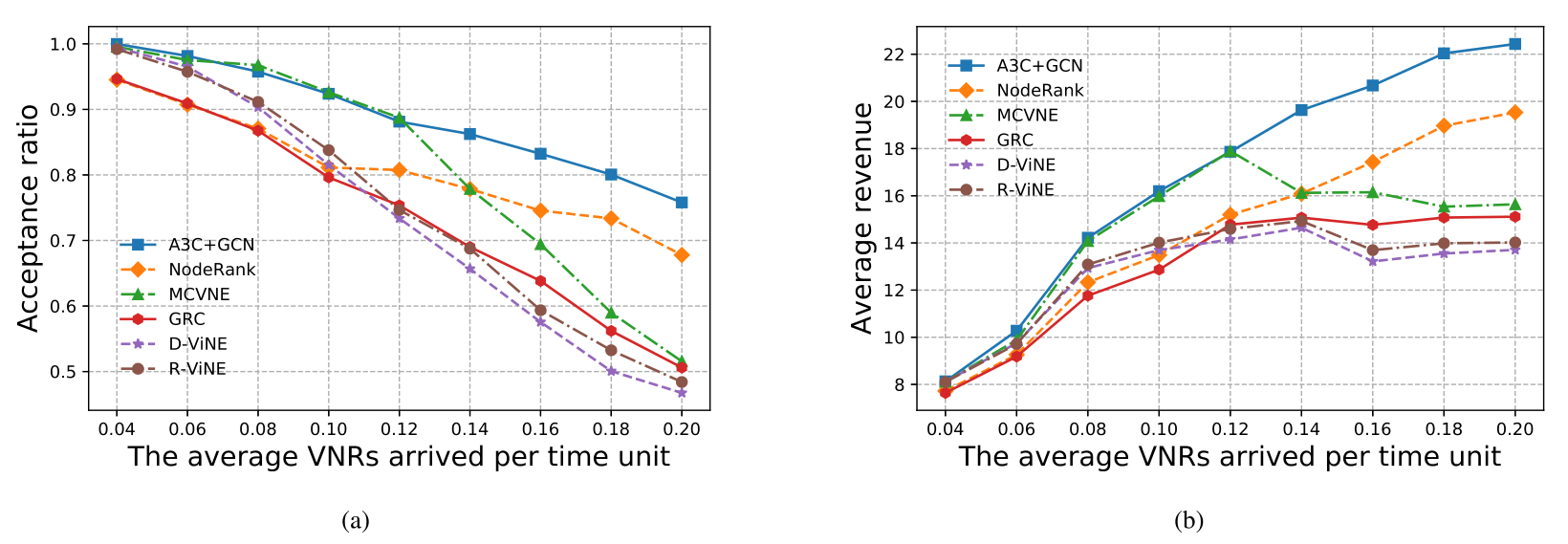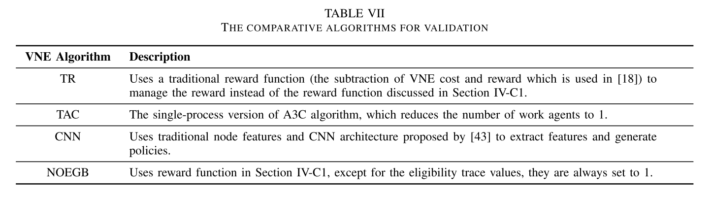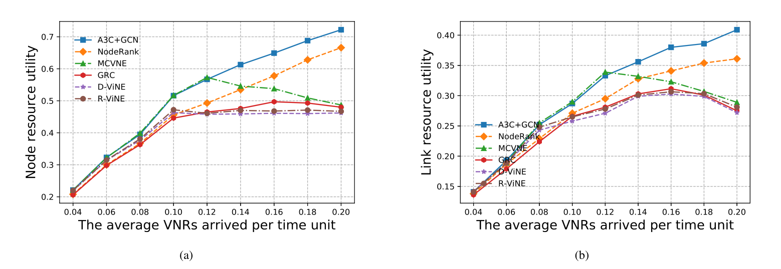 本篇论文将强化学习A3C算法与图卷积神经网络GCN相结合,并且设置了多目标的奖励函数,提出了一种更加高效的虚拟网络嵌入算法。