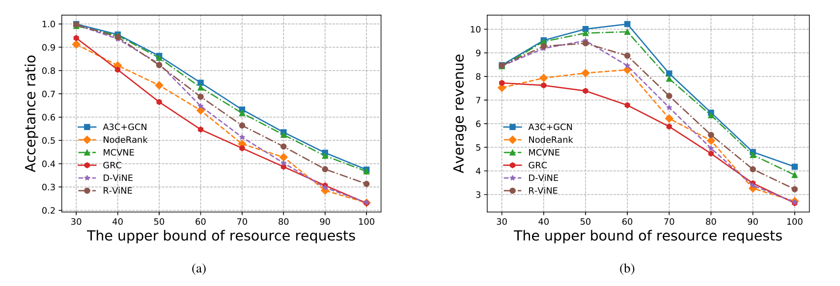 在不同的资源请求情况下,对这些算法进行测试,见下图(b)