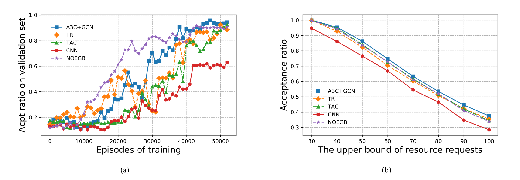 实验结果:在不同数量的资源请求情况下,该算法的接受率均是最优的;此外,可以发现CNN的性能表现始终是最差的