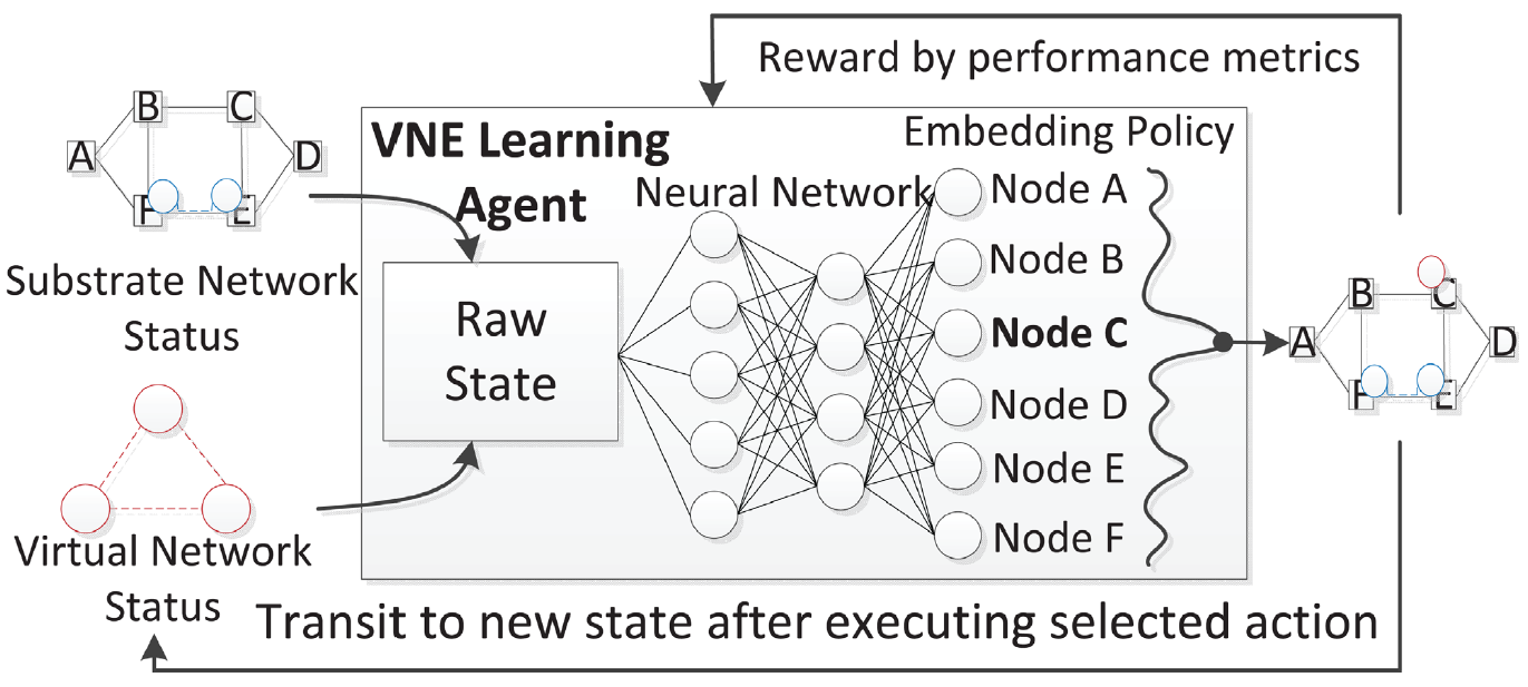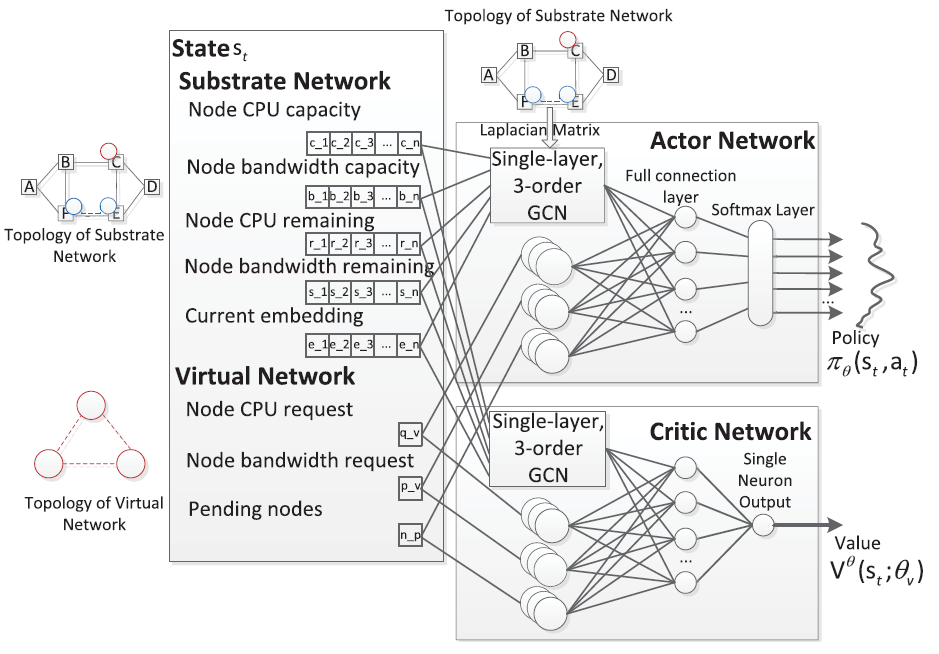 关键技术:虚拟网络嵌入, 强化学习, 图卷积神经网络