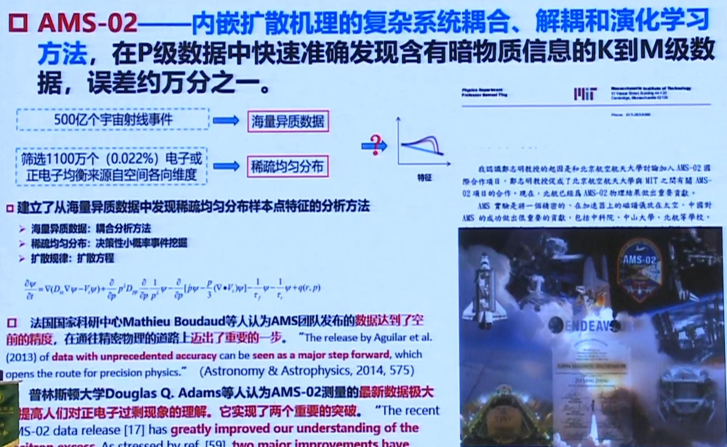 - AMS-02——内嵌扩散机理的复杂系统耦合、解耦和演化学习方法,在P级数据中快速准确发现含有暗物质信息的K到M级数据,误差约万分之一。
