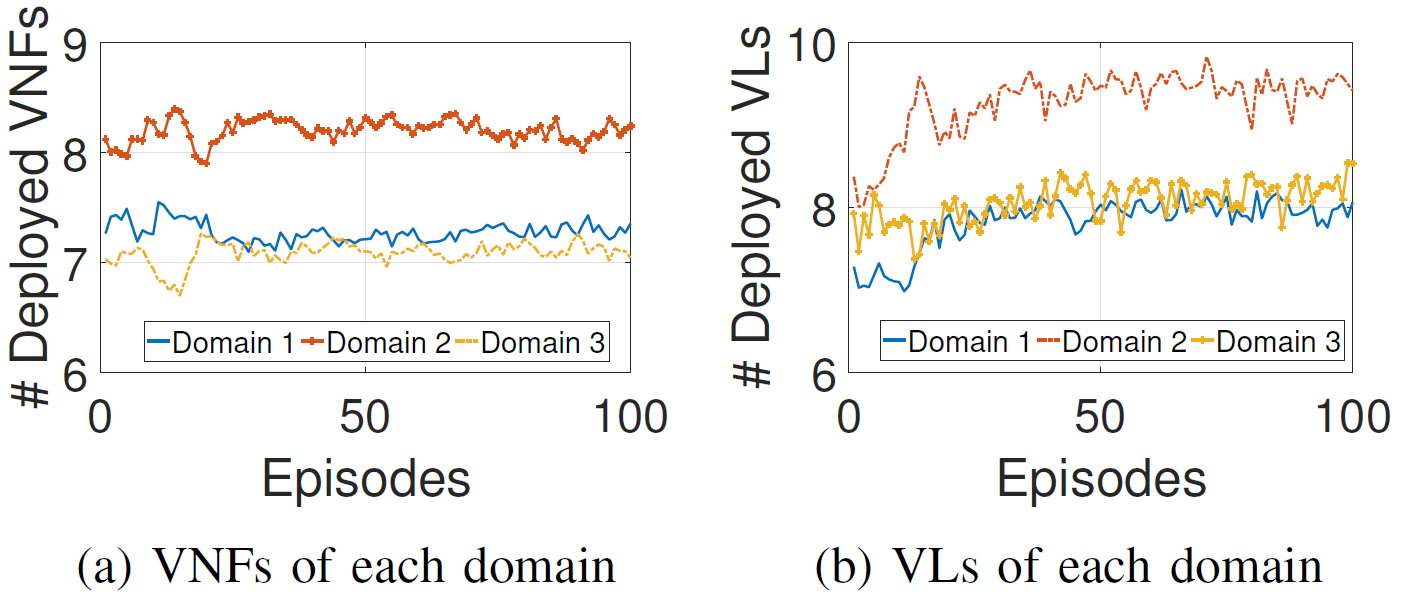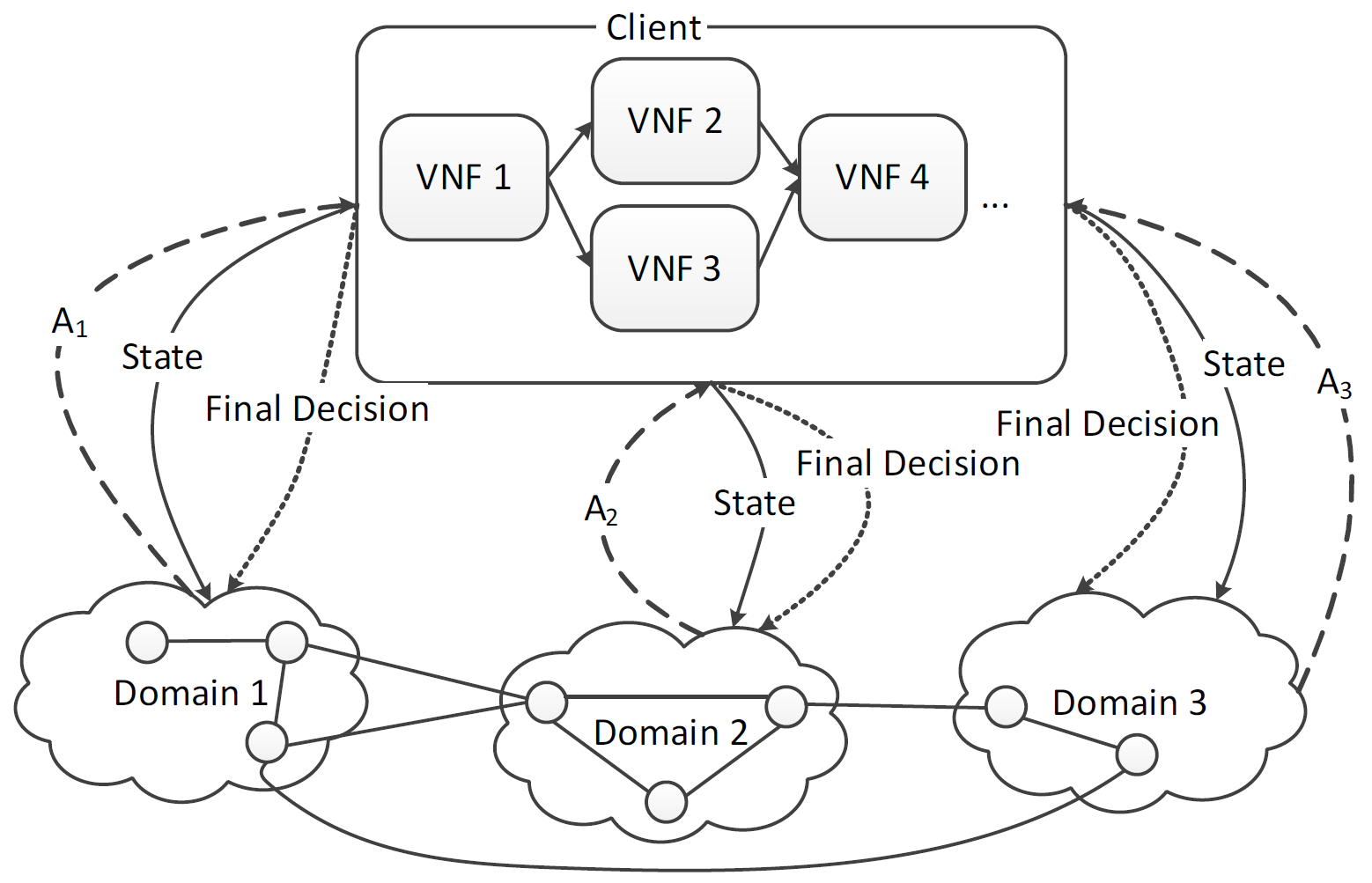 对于域\(i\),其目标是找到一个从VNF-FG请求到本地动作的映射策略:\(\mu_i:S \rightarrow A_i\)来最大化获得奖励。