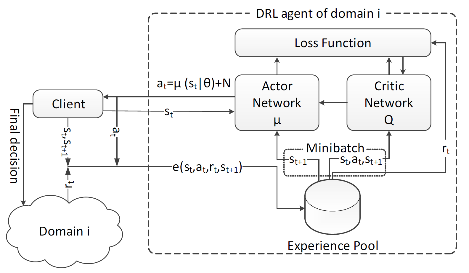 收到每个域返回的动作(资源竞价),中心客户会做出最终的决定并执行,然后每个域会依据提供的资源收到相应的奖励,最后DRL代理会计算loss来更新参数。