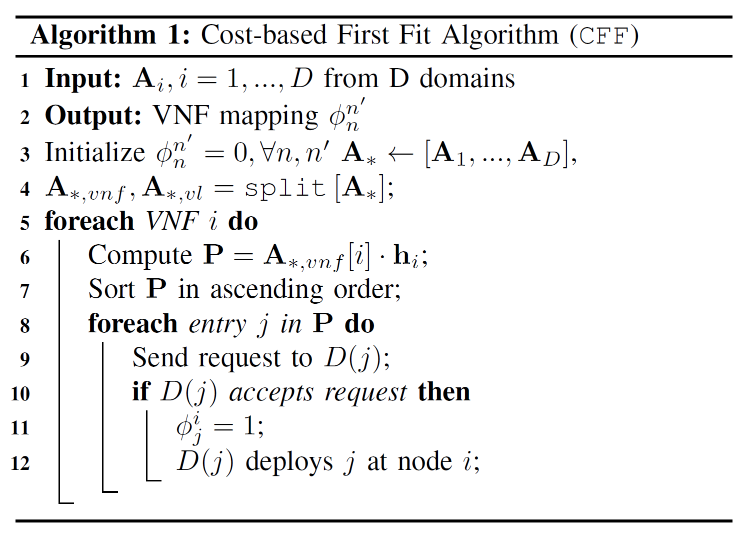 主要创新:多域非合作场景;多通道的VNF-FG请求矩阵表示;基于Cost的First Fit算法