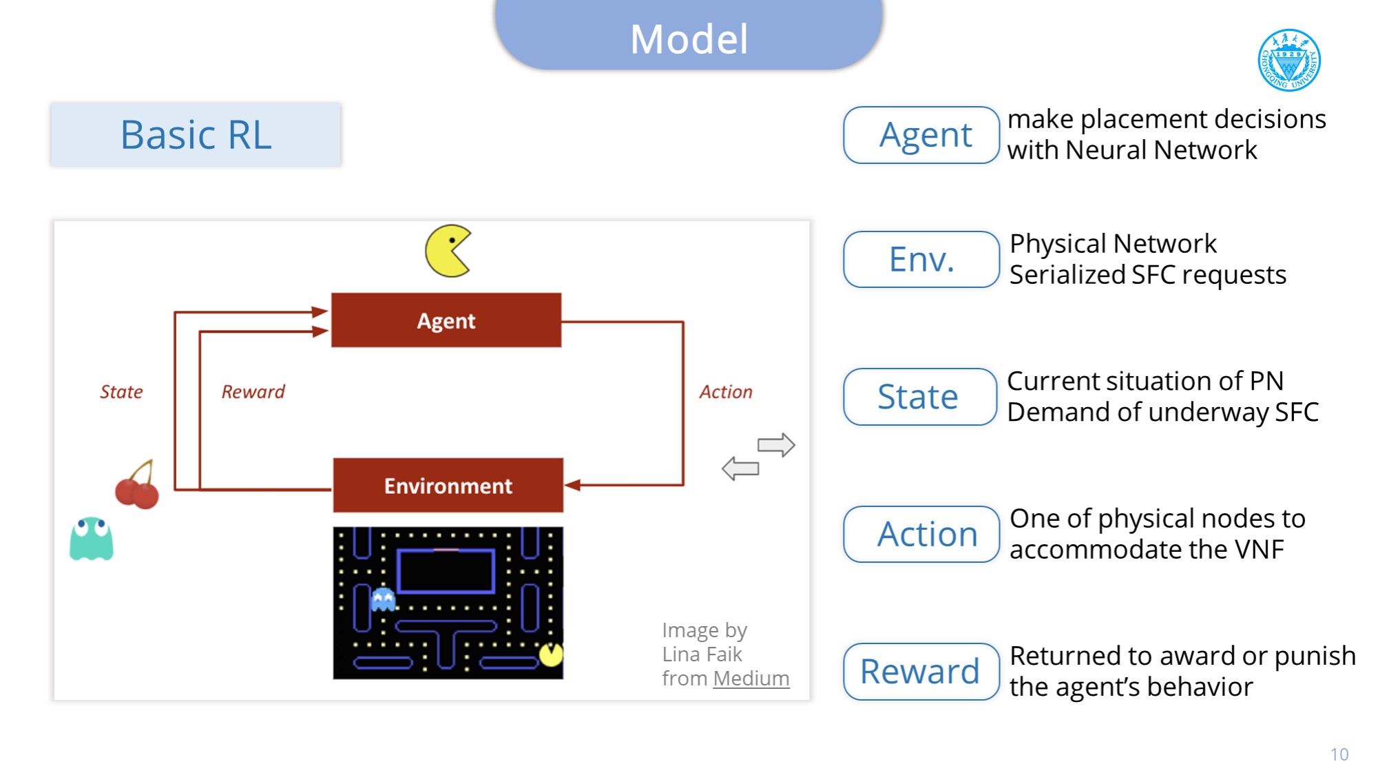 The physical network and SFC requests are considered as the environment. Intuitively, the state includes the current physical network features and the SFC request demands. The action is actually one of the physical nodes to accommodate one VNF. Primarily, we employ a customized neural network as the agent to make placement decisions. According to the deployment result, the calculated reward is returned to award or punish the agent.