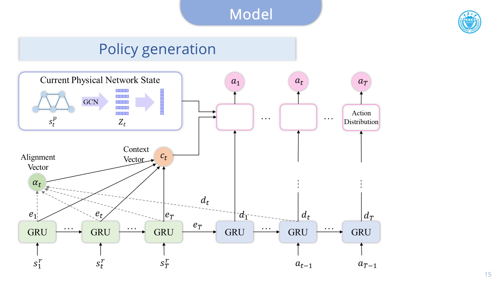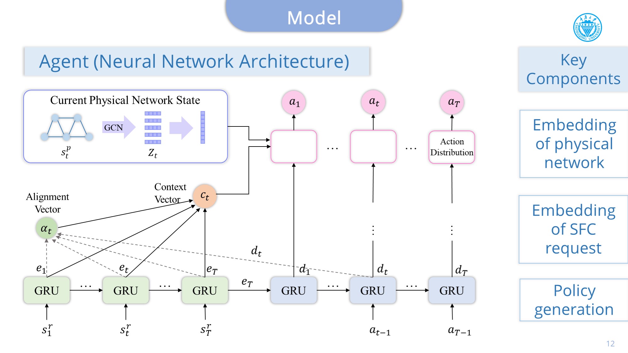 The architecture of our model is illustrated in this figure, consisting of three main components: Embedding of physical network, Embedding of SFC request and Policy generation. Subsequently, I will explain them in detail.
