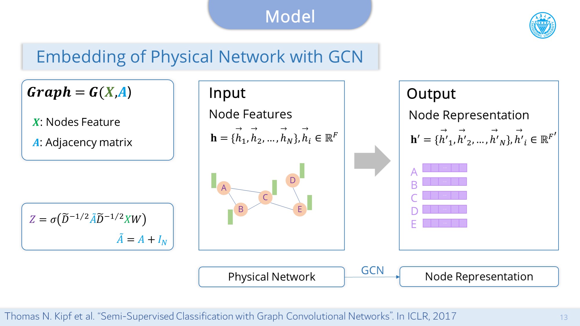Graph Neural Network has recently become a hot topic in machine learning that has been widely used in many fields. Owing to its adaption to graph structure, we use GCN to extract features of physical network. Namely, the input node features are transformed into new node Representations by GCN.