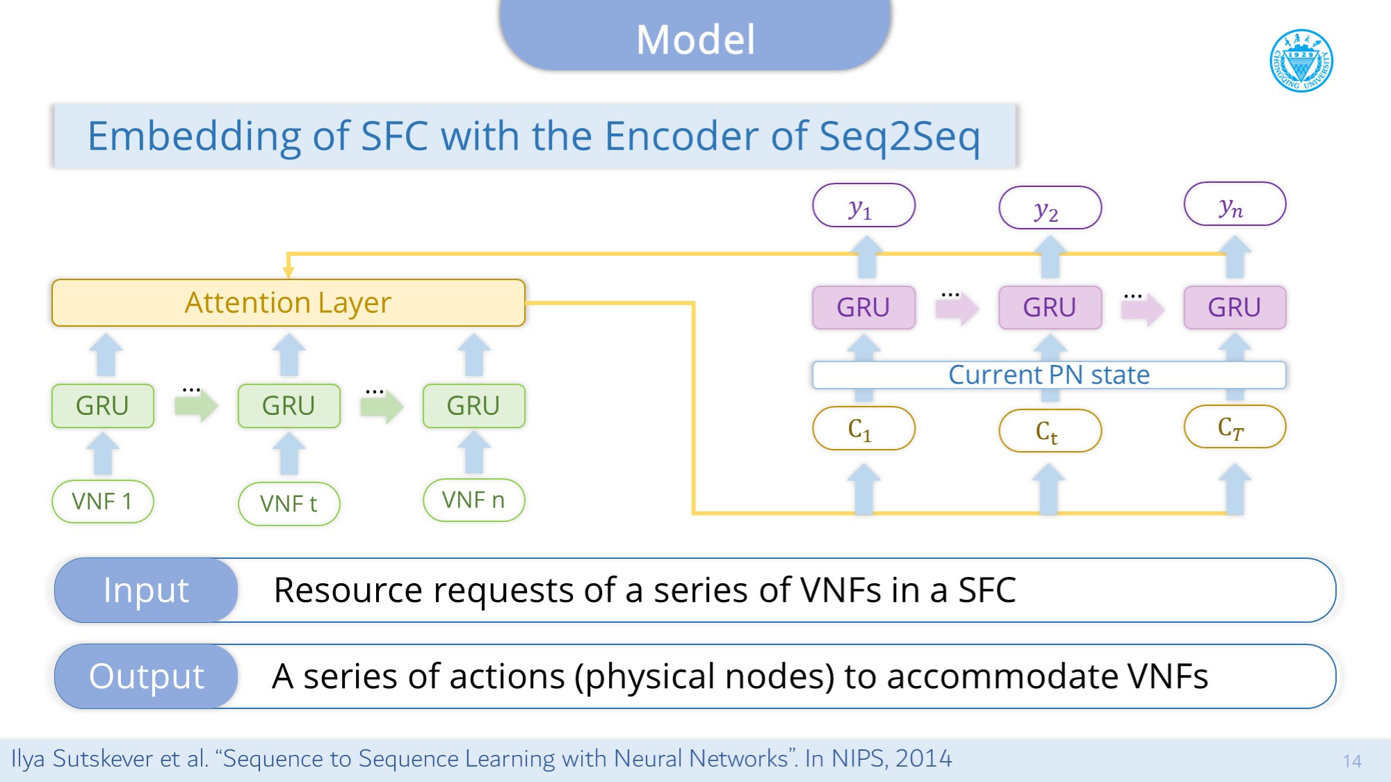 To capture orderly requirement of SFC requests, we utilize the encoder of the Seq2Seq model, which is implemented by gated recurrent unit (GRU) network. In the beginning, a sequence of VNF is input into the encoder to obtain the temporal relationship. Then, in each timestep, an action to place the current VNF will be output by the decoder.
