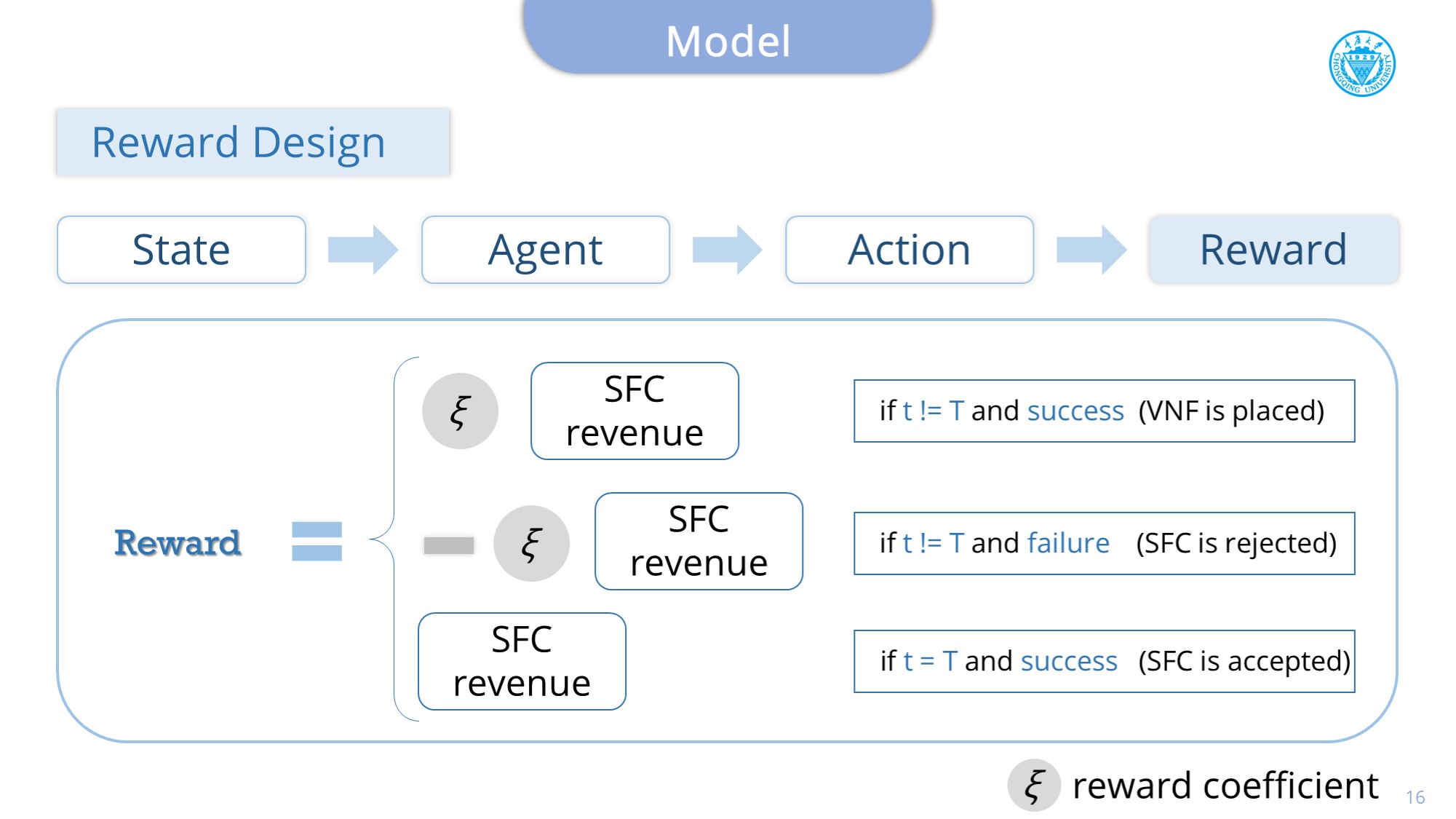 Next, the reward signal is designed to encourage the agent to place SFCs to maximize the long-term average revenue.
