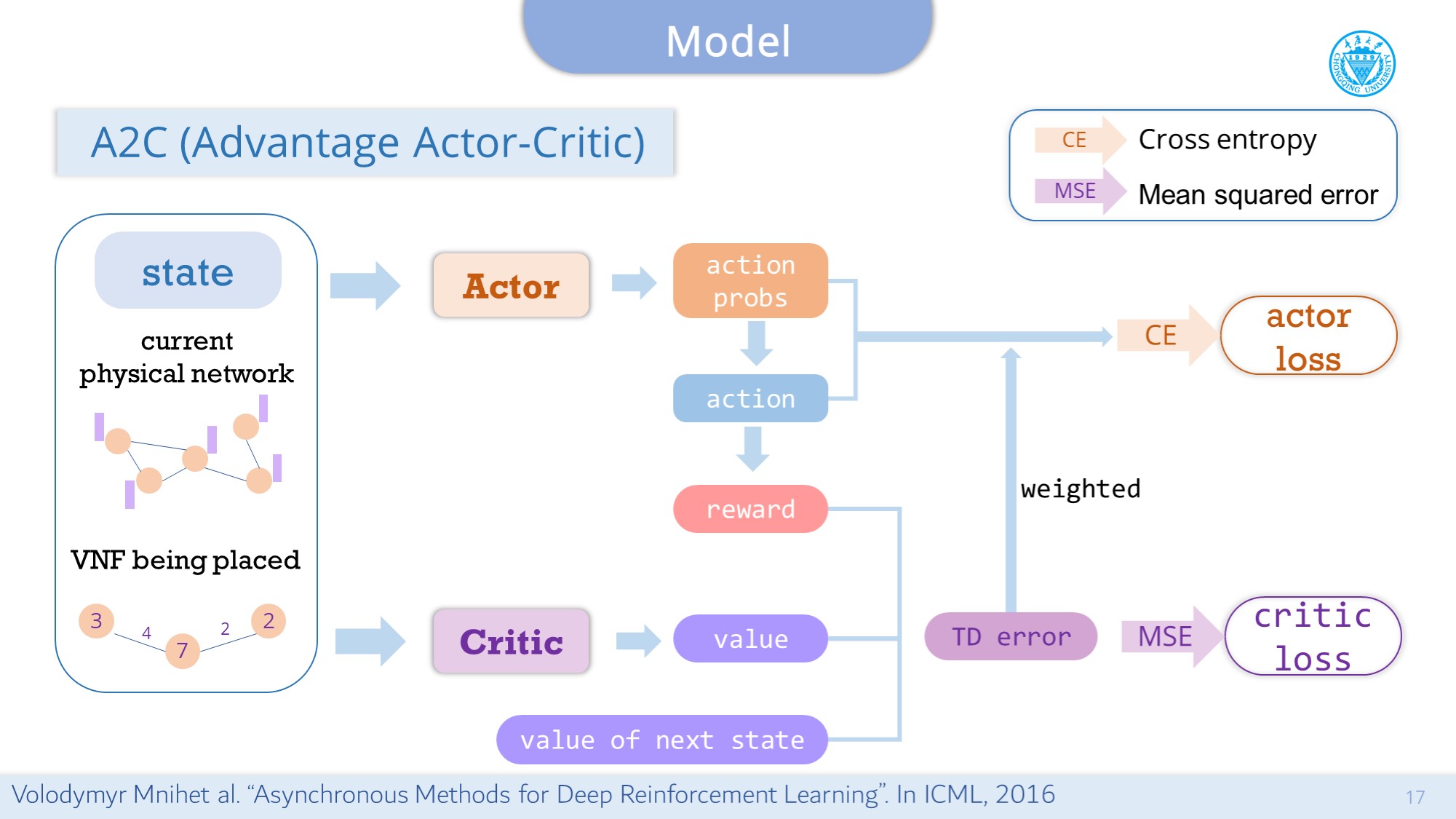 Advantage actor-critic is an efficient training method for discrete action space. Both actor and critic are composed of the aforementioned neural network but have disparate output. The state, including the features of the current physical network and VNF being placed, is input into the actor network. The agent selects the action based on the probability distribution, and the environment returns the reward. Meanwhile, we can obtain a value estimating the state after the same state is input into the critic network. Then, with the help of reward and this value, the Temporal error can be calculated to optimize the actor and critic.