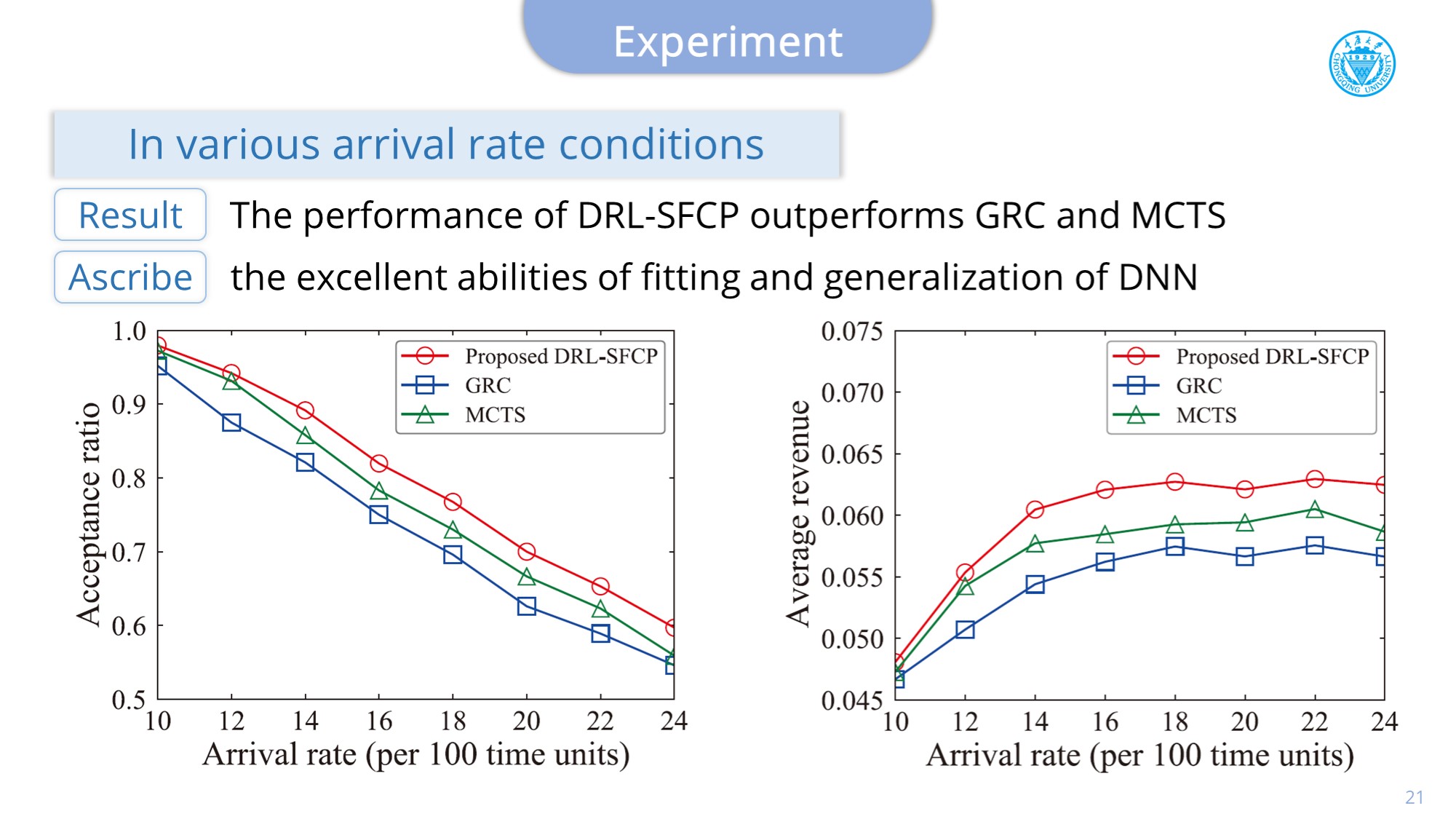The figures provide the experiment results of three algorithms in various arrival rate conditions. Our model's impressive performance can always attain the best deployment results, which shows the excellent abilities of fitting and generalization of DNN.