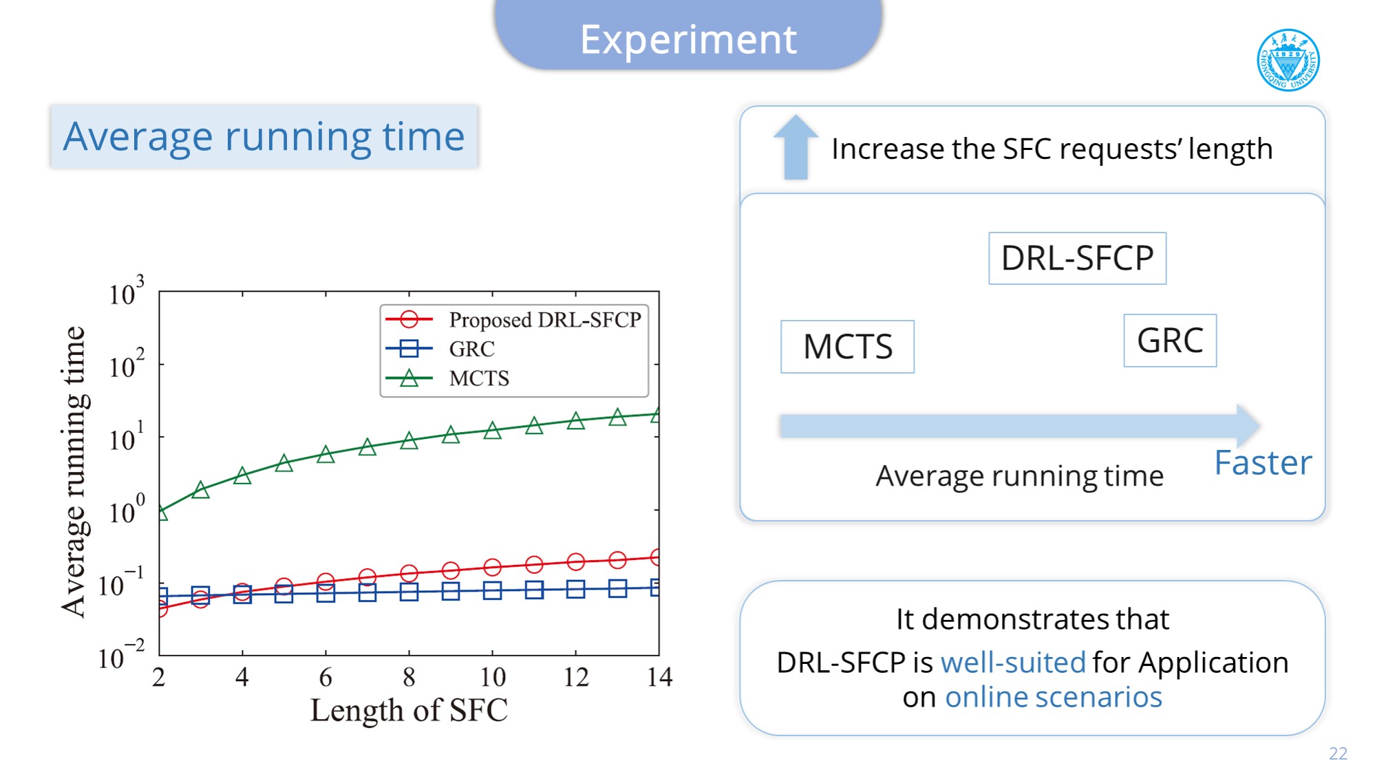 In this experiment, we estimate the average processing time in different SFC lengths to test our model's scalability. As the length of SFC request increases, the average processing time of our model is slightly inferior to GRC but much faster than MCTS, which demonstrates that our model is well-suited for Application on online scenarios.