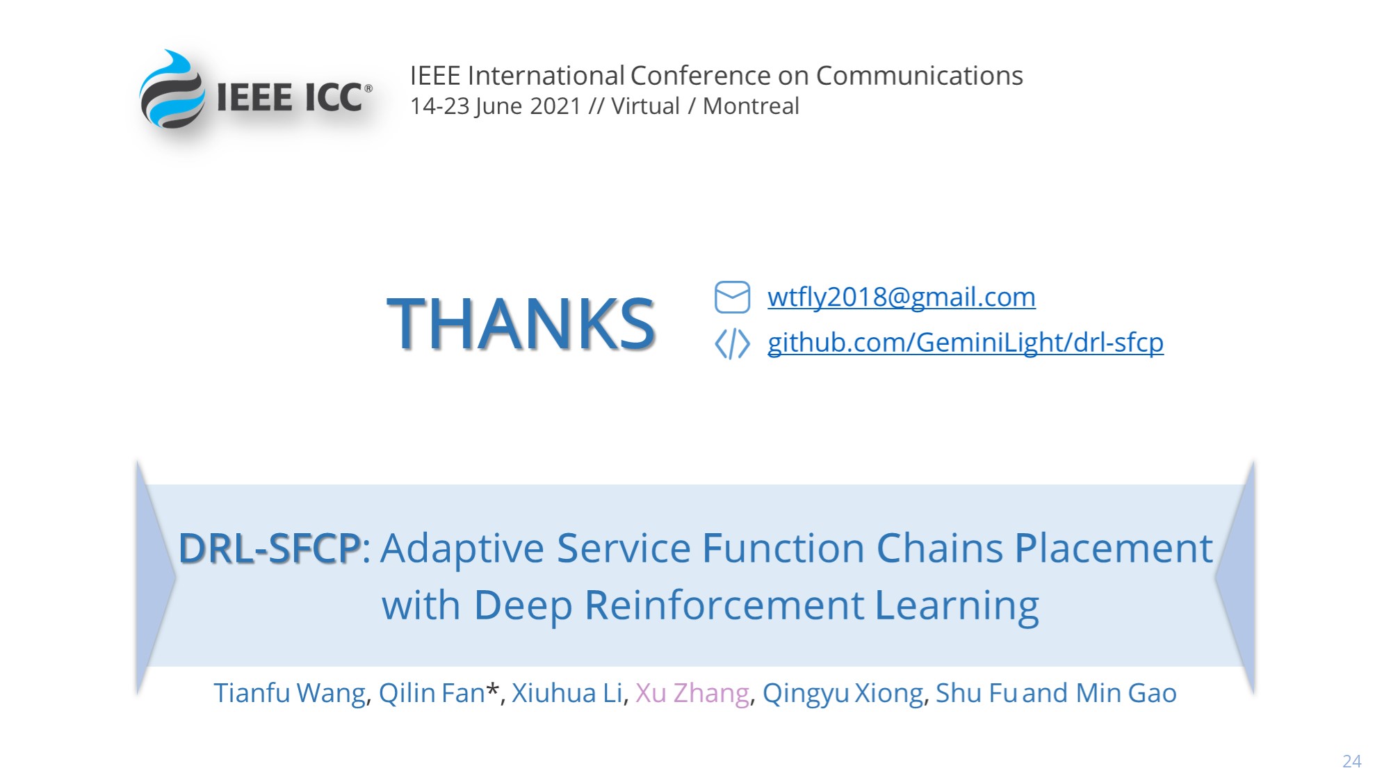 This is a presentation on our paper named "DRL-SFCP" accepted by IEEE ICC 2021, where a novel algorithm integrating GNN, Seq2Seq model and DRL is proposed.