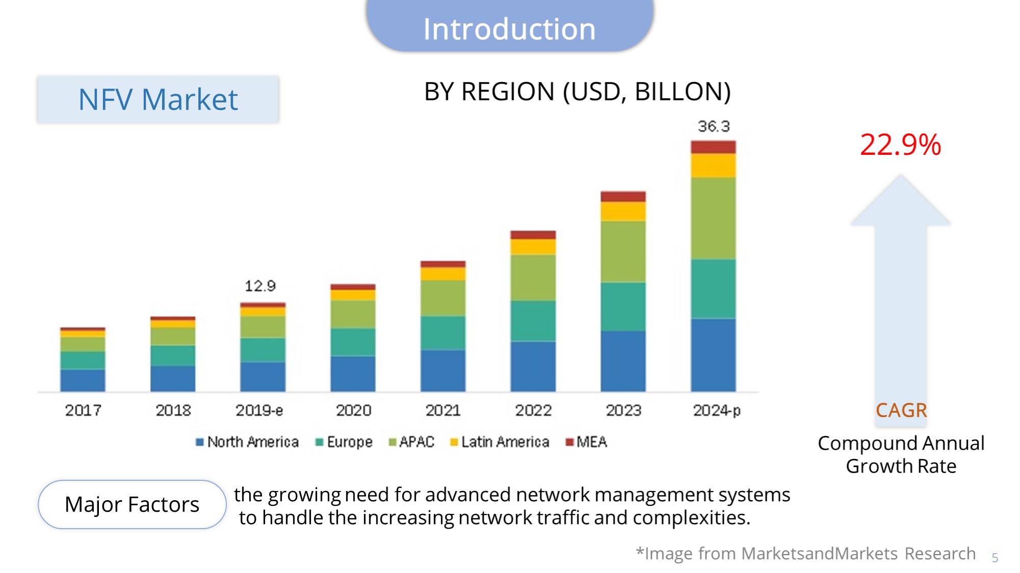 The global NFV market is expected to grow from USD twelve point nine billion in twenty nineteen to USD thirty six point three billion by twenty twenty four, at a CAGR (Compound Annual Growth Rate) of twenty two. nine % during the forecast period.