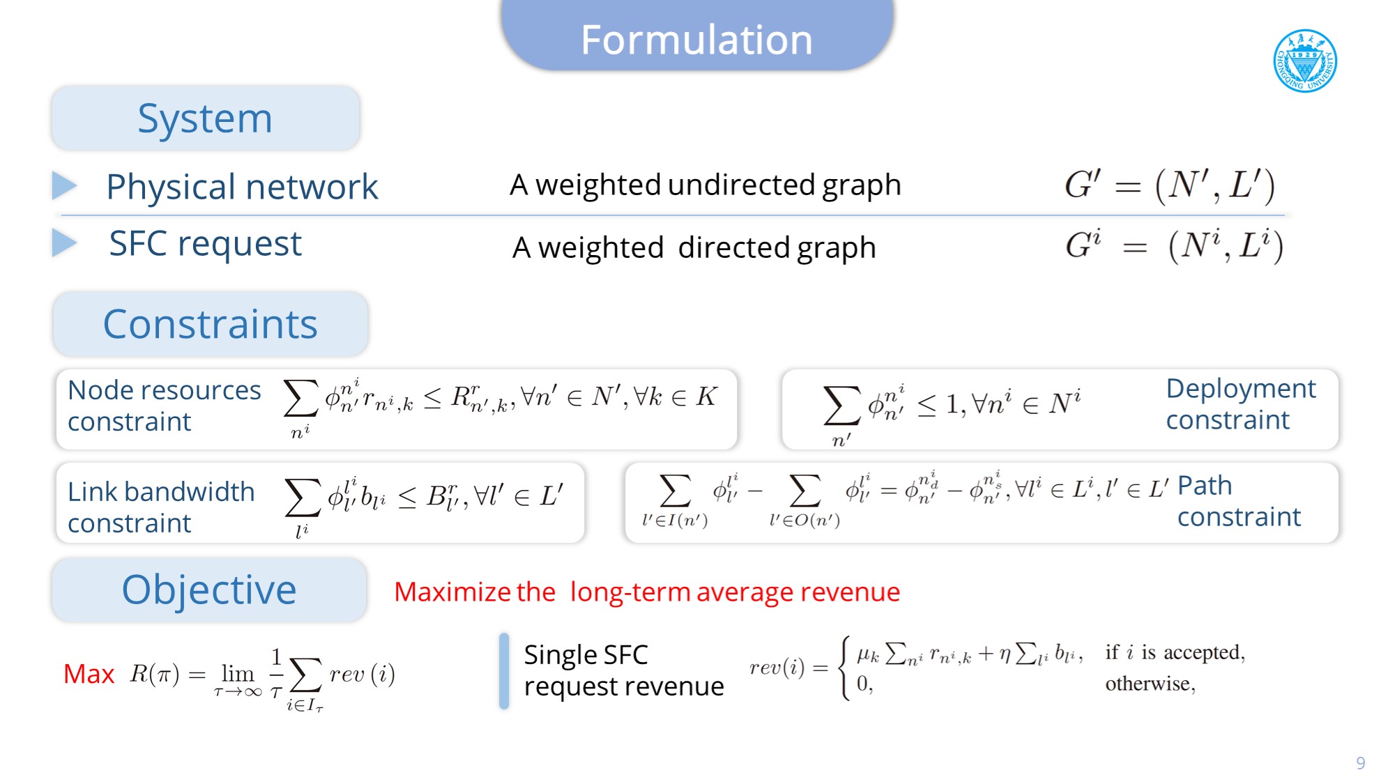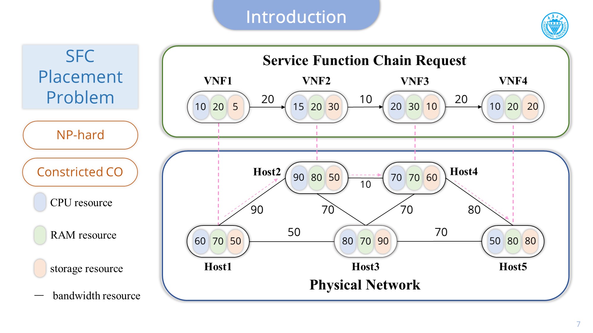 - The last one is the deployment constraint: When handling the same SFC request, each physical node only can accommodate one VNF.